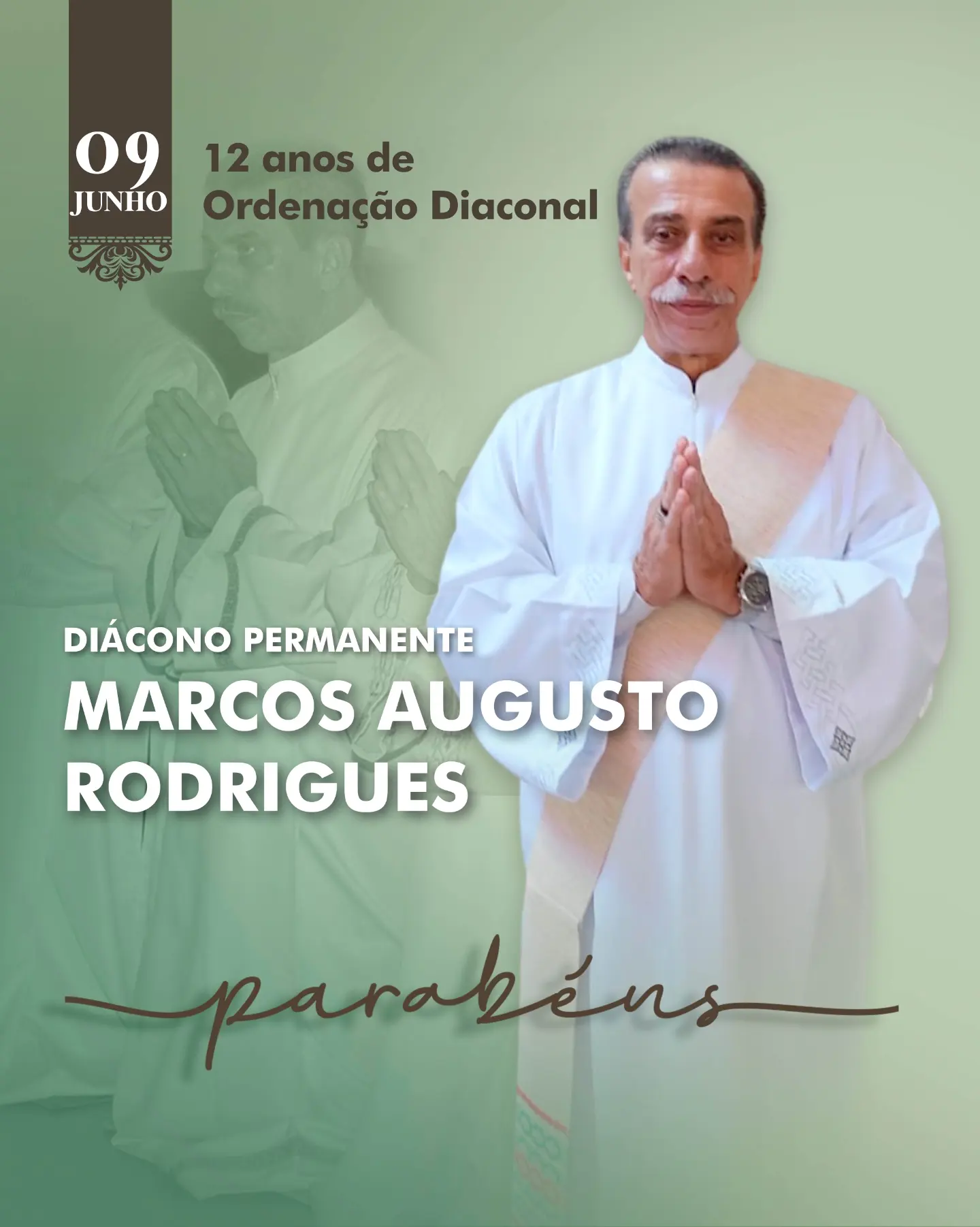 Neste Domingo (09), celebraremos em Ação de Graças pelos 12 anos de Ordenação Diaconal do Diácono Marcos. Vamos juntos, rezar pela missão e pela vida desse servo amado de Deus e muito querido por todos nós.