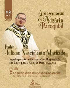 No próximo sábado (12/10), dia dedicado a Padroeira do Brasil, iremos acolher em nosso meio, Pe. Juliano Machado, que assume como nosso Vigário Paroquial. A Missa de Apresentação será realizada na Comunidade Nossa Senhora Aparecida em Vila Palestina, Cariacica, às 18h