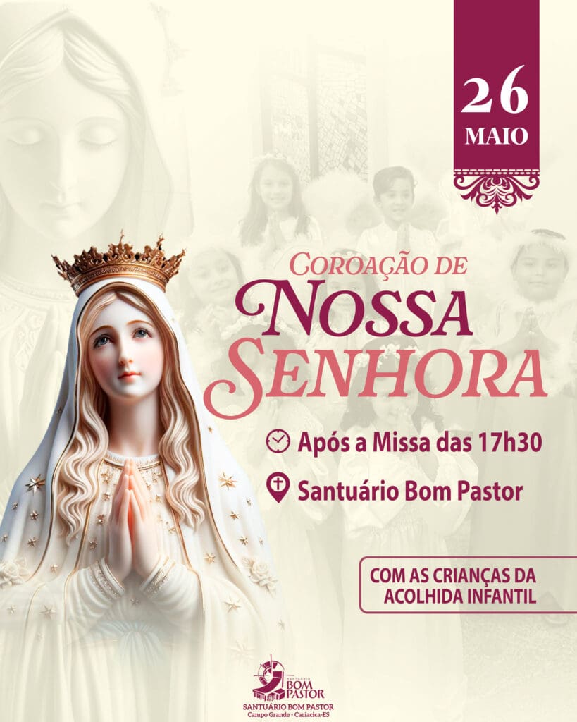 Neste Domingo (26), teremos Coroação de Nossa Senhora com as crianças. Venha participar e vamos juntos homenagear Nossa Rainha