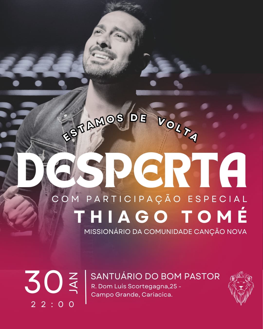 Na próxima terça-feira (30/01) termos o primeiro encontro do Desperta Bom Pastor em 2024. Com a participação especial do Missionário da Comunidade Católica Canção Nova, Thiago Tomé. Como de consume, o encontro irá acontecer todas terça-feiras ás 22:00.