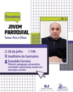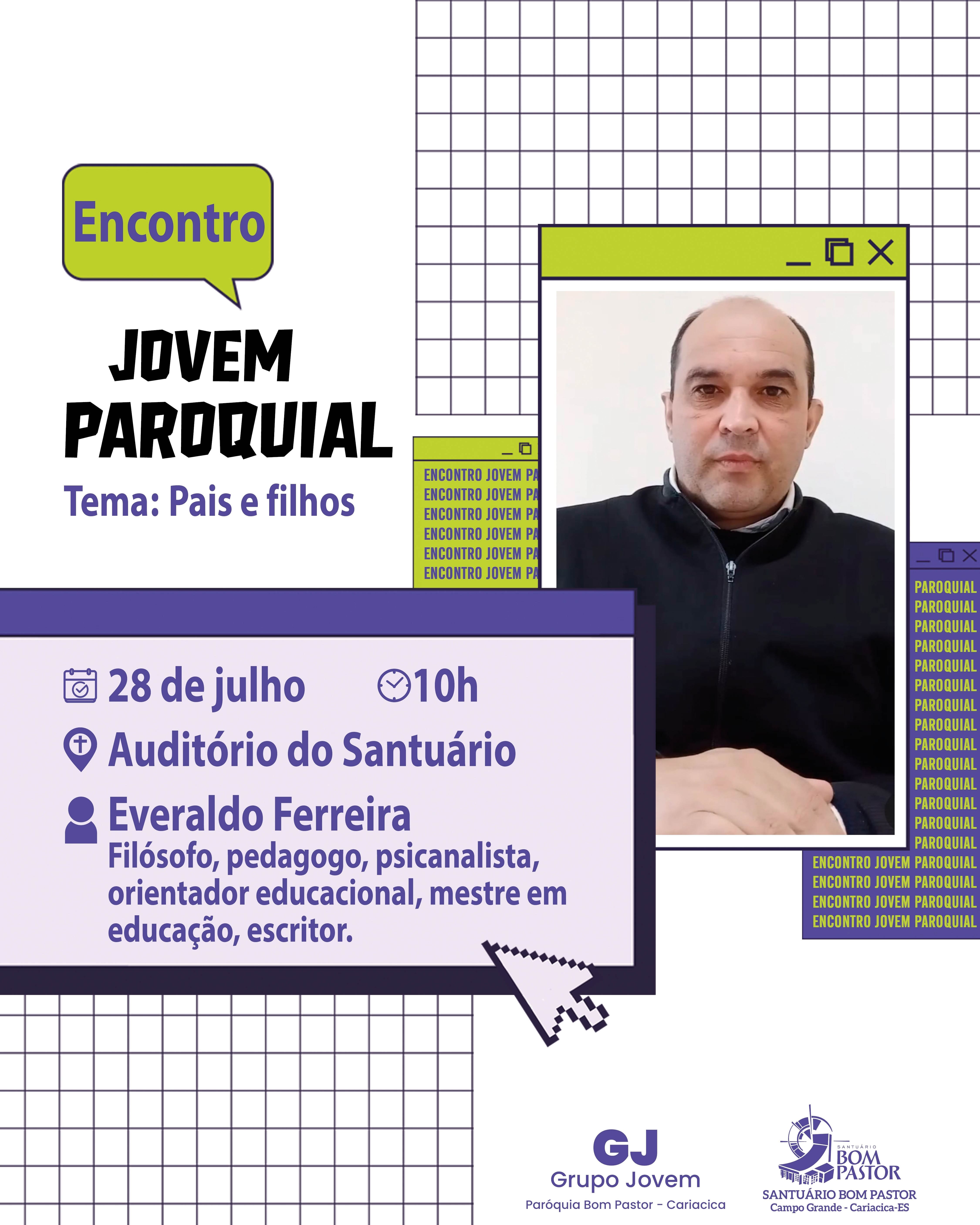 O GJ – Grupo Jovem Paroquial, convida toda a juventude para um Encontro Jovem muito especial. Nese encontro, teremos uma palestra sobre pais e filhos, com Everaldo Ferreira Garcia, profissional que atua com a pastoral familiar há mais de 10 anos. Além disso, Everaldo é filósofo, pedagogo, psicanalista, orientador educacional, mestre em educação e escritor.