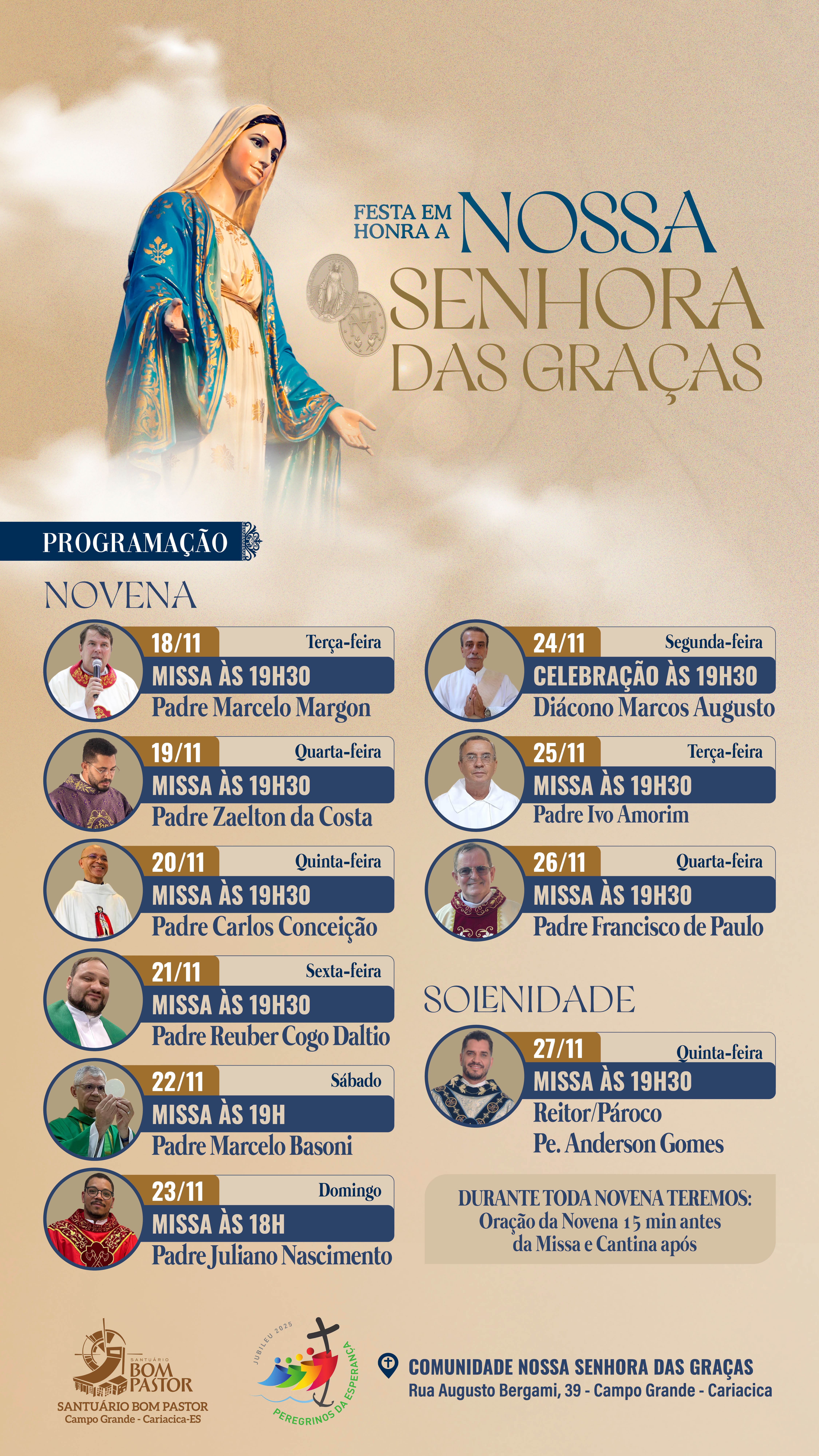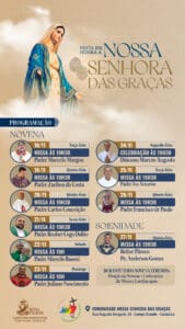 Toda programação da Novena, bem como a Solenidade, será realizada na Comunidade Nossa Senhora das Graças. Portanto, fique atento a localização e a programação completa desses dias dedicados à Mãe do nosso Senhor.