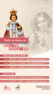 Toda programação do tríduo, será realizada na Comunidade Jesus Menino, que faz parte de nossa Paróquia. Portanto, confira a nossa programação e venha participar conosco, preparando o coração pra receber Jesus, que deseja habitar em nós.