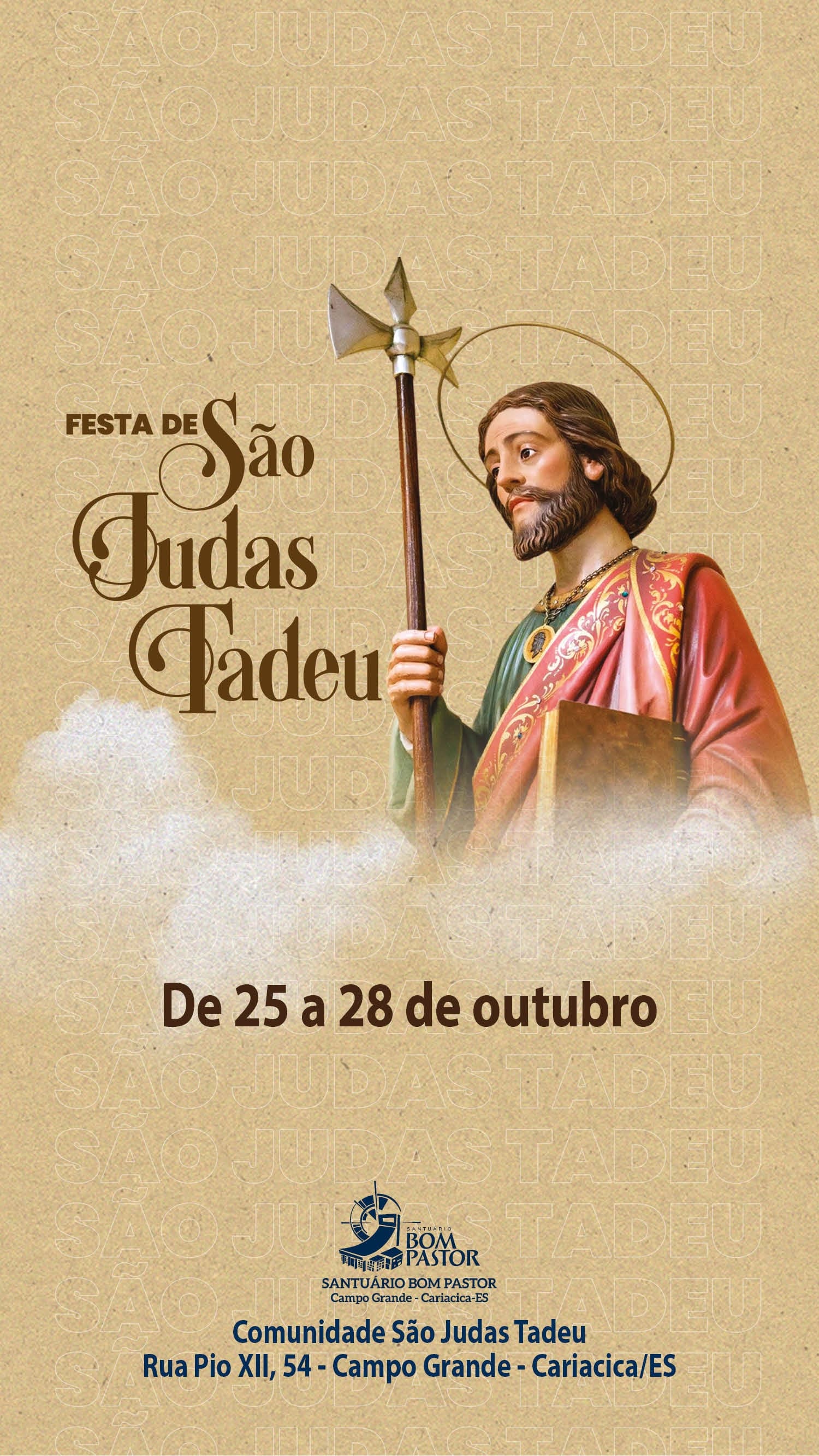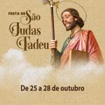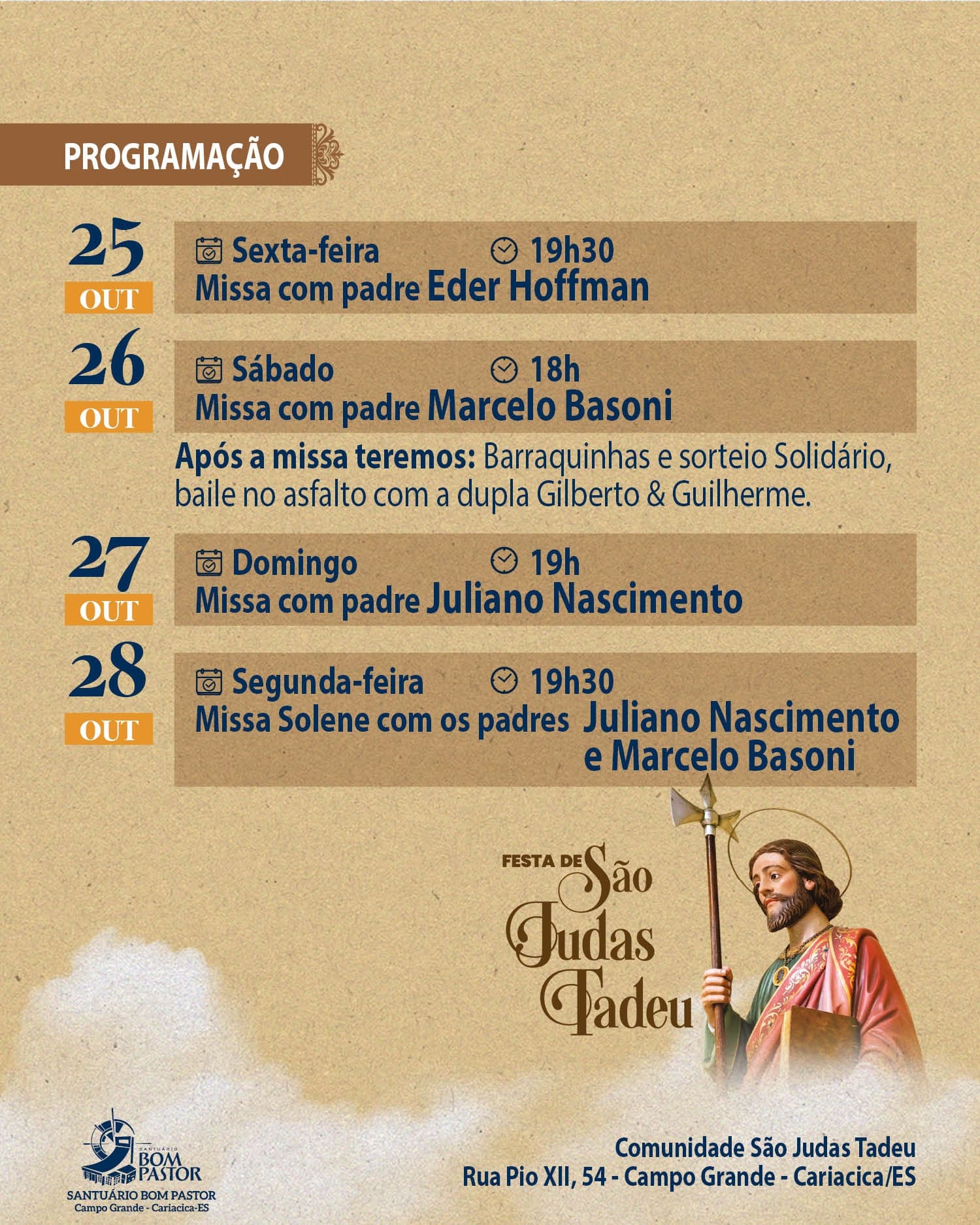 Dos dias 25 a 28 de outubro, a comunidade São Judas Tadeu estará em festa, celebrando em honra ao seu Padroeiro. Serão três dias de tríduo e o encerramento com a Missa Solene.