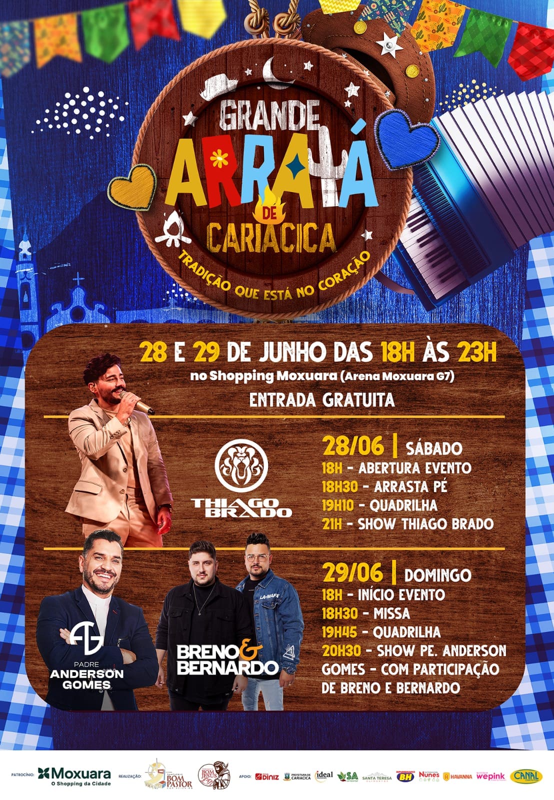 Serão dois dias intensos de música, quadrilhas, fé e comidas típicas, tudo isso em um ambiente preparado com muito carinho, na Arena Moxuara – G7, das 18h às 23h. O evento é uma realização das Paróquias Bom Pastor e Bom Jesus, em parceria com o Shopping Moxuara e grandes apoiadores da nossa cidade.