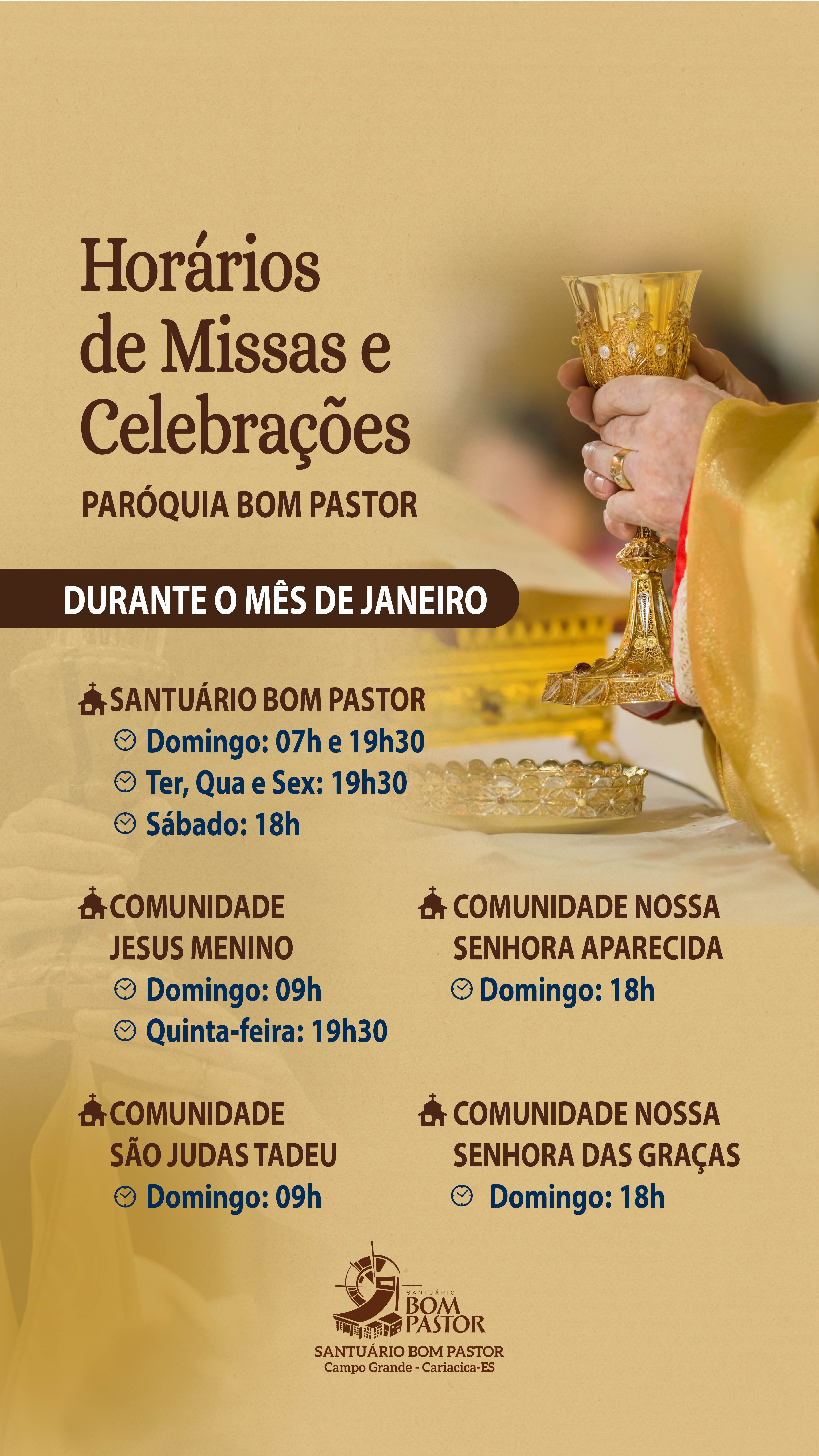 Fique atento(a) aos nossos horários de Missa e Celebração durante o mês de Janeiro de 2025. Excepcionalmente nesse período, alguns horários sofrem algumas alterações.