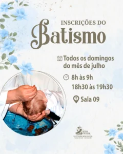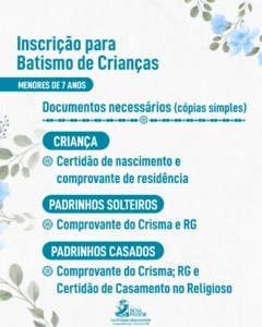 Durante todo o mês de julho, estarão abertas as inscrições para realização do Sacramento do Batismo. Veja abaixo, os dias e local da inscrição e quais documentos são necessários