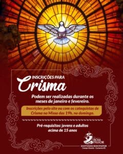 Podendo ser realizadas durante os meses de janeiro e fevereiro, clicando aqui ou com os catequistas de Crisma durante a Santa Missa das 19 horas, nos domingos.