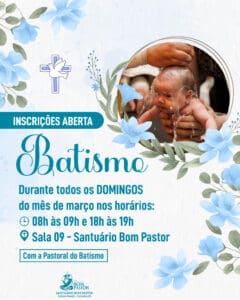 Durante todo mês de março, estarão acontecendo as inscrições para o Sacramento do Batismo. Para realizar a inscrição, basta procurar a Pastoral do Batismo aos domingos, no Santuário Bom Pastor (na sala 09)