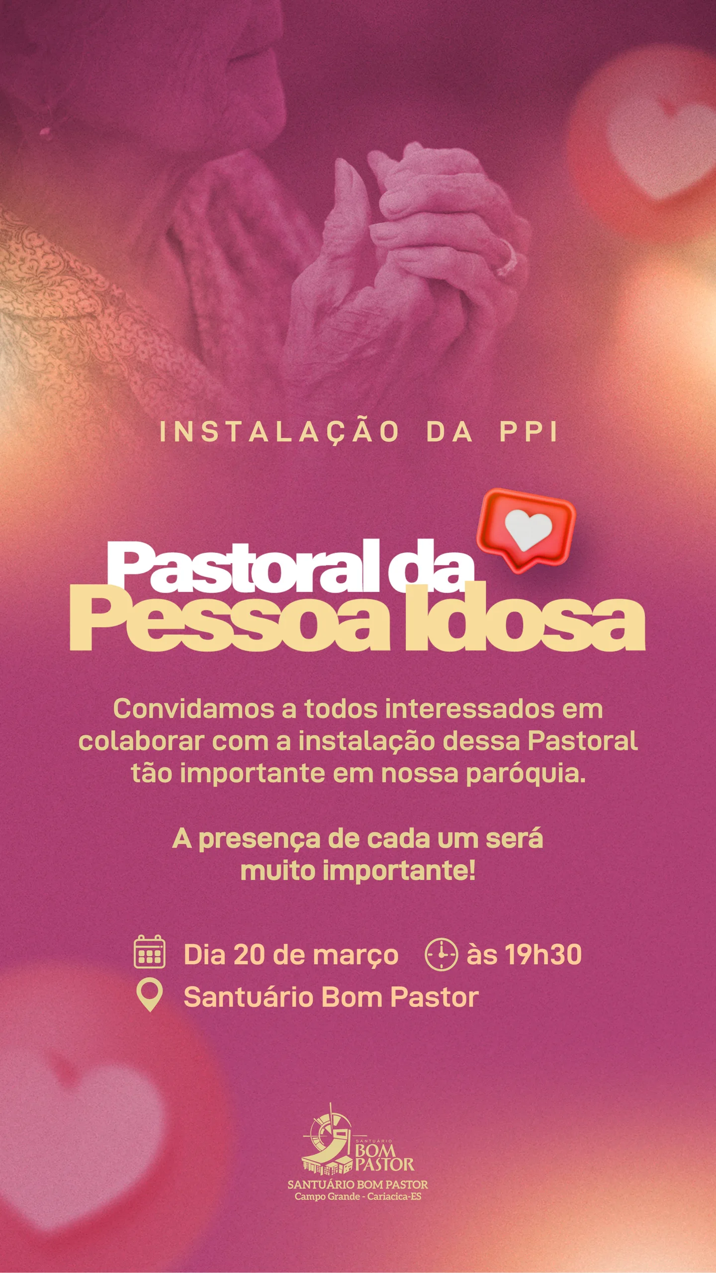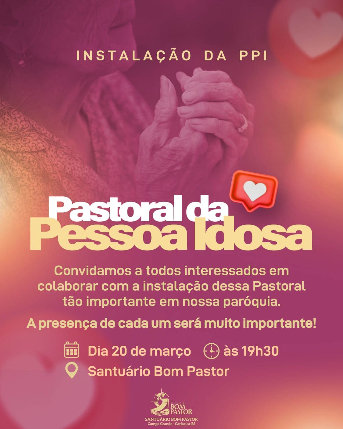 No dia 20 de março, às 19h30, teremos a Instalação da PPI – Pastoral da Pessoa Idosa. Que tem como missão a promoção e valorização da Pessoa Idosa.