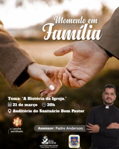 O primeiro Momento em família deste ano, será realizado dia 21 de março (quinta-feira) às 20h, no auditório do Santuário Bom Pastor. Neste dia, iremos falar sobre a História da Igreja e estará presente, abordando esse tema, nosso Reitor Pe. Anderson Gomes @peandersongomes
