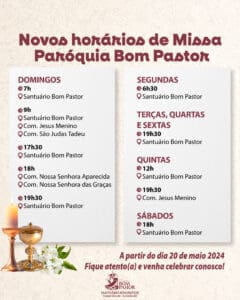 A partir do dia 20 de maio, teremos alteração nos horários de Missa. Confira abaixo: