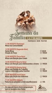 Do dia 11 a 17 de agosto, te convidamos a participar conosco da Semana da Família. Vamos juntos rezar por nossos lares, para que brote do seio familiar, vocações que nos conduzem ao caminho da Santidade.