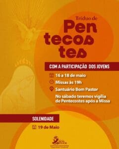 Com o incentivo e participação da Juventude Paroquial, iniciamos nesta quinta-feira (16), o Tríduo em preparação a Solenidade de Pentecostes. Serão três dias de Missas e no sábado (18), teremos um grande clamor pelo Espírito santo de Deus após a Santa Celebração.